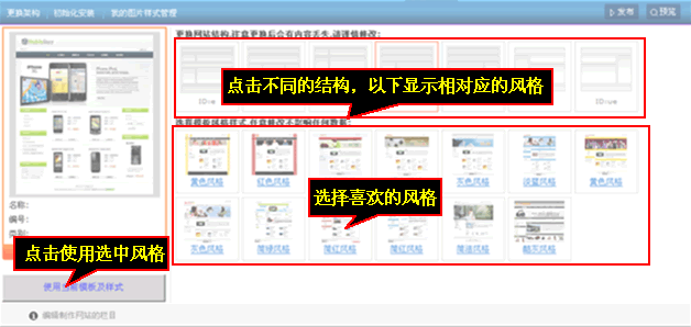 点击每种网站结构对下都会显示相应的模板风格,在选择好模板风格后点击左边的“使用当前模板及样式”便可更换,如果不喜欢更换后风格只要切换到原来的模板样式就可以。