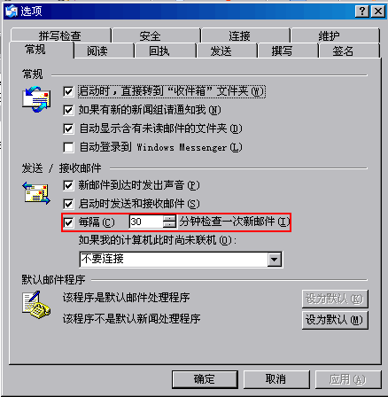 在常规选项里面设置如图中:每隔  分钟检查一次新邮件,您可以根据需要进行设置。